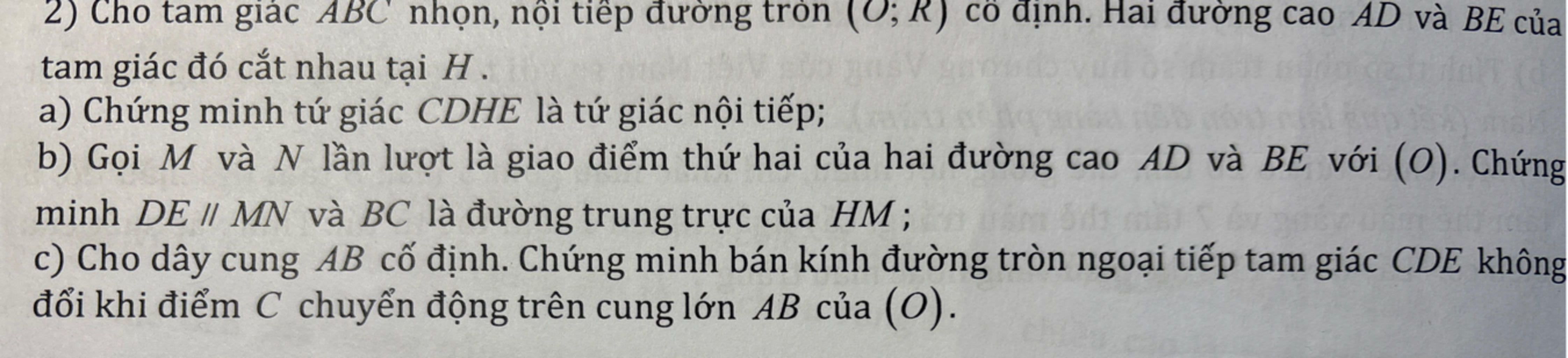 c) Tứ giác `CDHE` nội tiếp `⇒ I` là tâm đường tròn ngoại tiếp `ΔCDE`