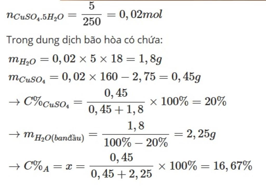 CHO DD A CHỨA CUSO4 NGẬM NC NỒNG ĐỘ X% SAU KHI CHO BAY HƠI 20% LƯỢNG NC THÌ DD TRỞ NÊN BÃO HOÀ,THÊM 2,75G CUSO4 VÀO DD BÃO HOÀ THÌ CÓ 5GAM CUSO4.5H20 A) TÍNH NỒNG ĐỘ % CỦA CUSO4.5H20 B) TÍNH NỒNG ĐỘ % CỦA DD A giúp em với ạ em cần gấp trước 6h20 ạ Em xon cảm ơn