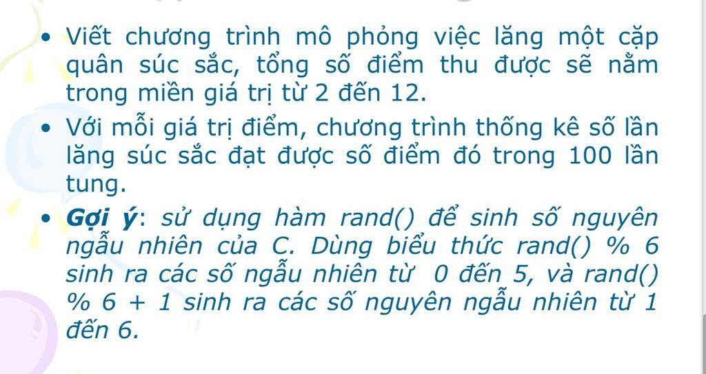 `\text{rand() % 6 + 1}` `->` tạo số từ `1` đến `6` (giống xúc xắc).