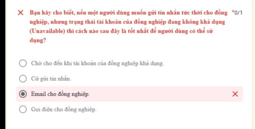 chọn gọi điện cho đồng nghiệp ,vì nếu đề cho là muốn gửi tin nhắn tức thời thì ko thể chờ đc cứ gửi tin nhắn thì đề lại cho là tk ko khả dụng nên chỉ có câu cuối là phù hợp nhất ,vì tuỳ loại đt có thể gọi khi tài khoản ko khả dụng