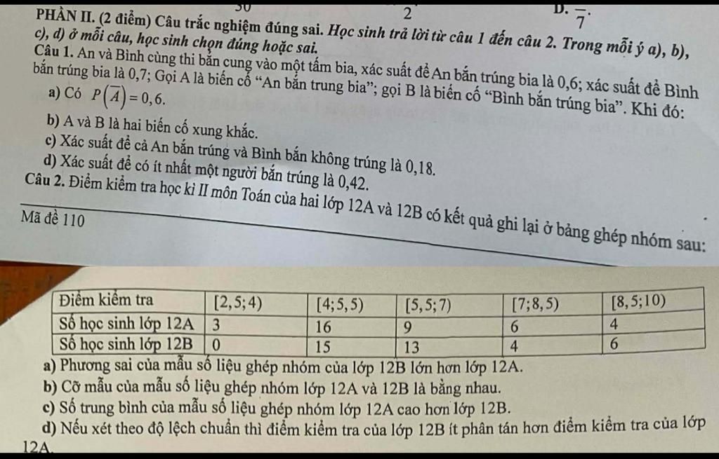 $P(A \cap \overline{B}) = P(A) \cdot P(\overline{B}) = P(A) \cdot [1 - P(B)] = 0,6 \cdot (1 - 0,7) = 0,6 \cdot 0,3 = 0,18 \Rightarrow$ Đúng