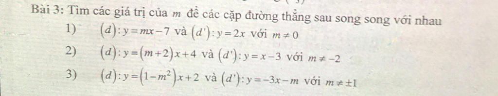 3) `(d) : y = (1- m^2)x +2 ; (d') : y = -3x -m ( m \ne ± 1)`