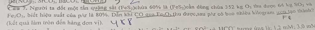 $$m_{FeS_{2}\text{ thực tế}} = 600 \times 80\% = 480\text{ kg}$$