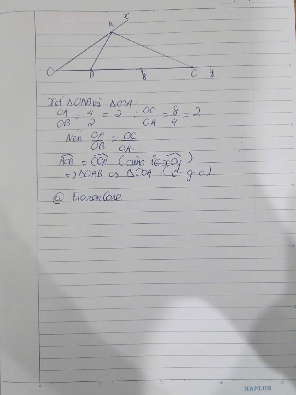 cho góc xoy trên ox lấy a sao cho oa=4, trên oy lấy b,c sao cho ob=2,oc=8.chứng minh tam giác oab đồng dạng với tam giác coa