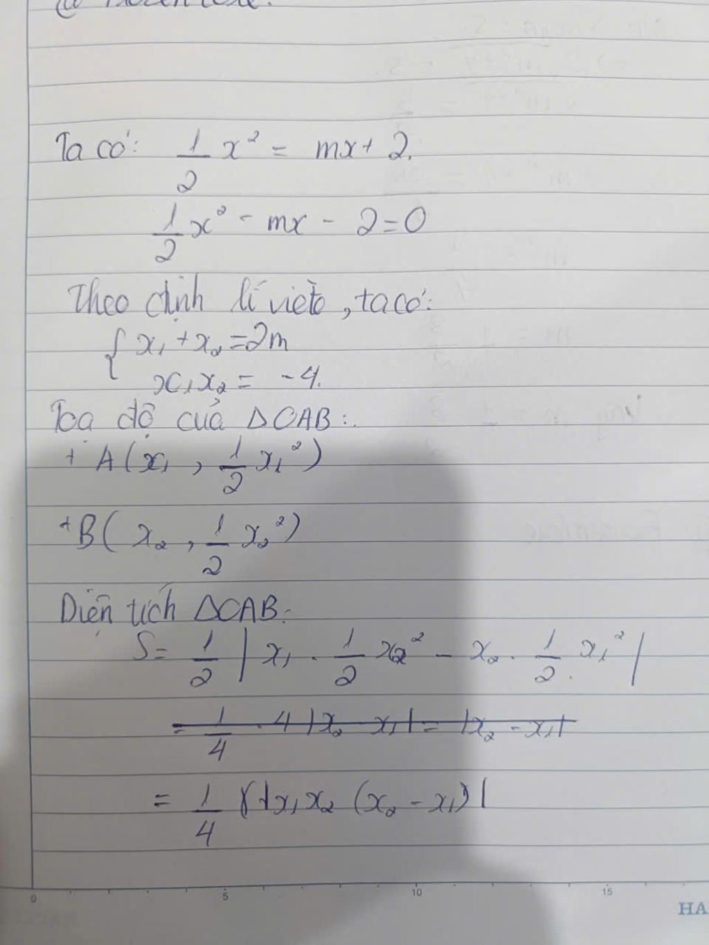 trong mặt phẳng Oxy,cho `(P):y=1/2 x^2 `và đường thẳng `(d):y=mx+2`.tìm tất cả m để (d) cắt (P) tại 2 điểm phân biệt A,B sao cho `S_(OAB)=5`