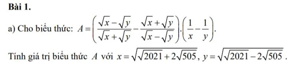 $A = \left( \dfrac{\sqrt{x}-\sqrt{y}}{\sqrt{x}+\sqrt{y}} - \dfrac{\sqrt{x}+\sqrt{y}}{\sqrt{x}-\sqrt{y}} \right) \cdot \left( \dfrac{1}{x} - \dfrac{1}{y} \right)$