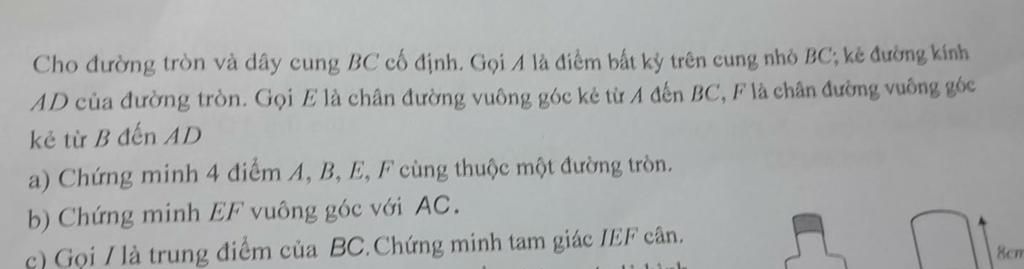 Cho đường tròn và dây cung BC cố định. Gọi A là điểm bất kỳ trên cung nhỏ BC; kẻ đường kính