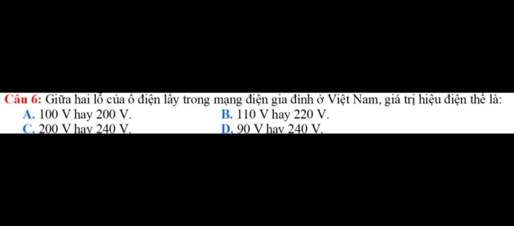 Giải thích các bước giải: hiện nay hầu hết các hộ gia đình và thiết bị điện dân dụng tại Việt Nam đều sử dụng mức hiệu điện thế định mức là 220 V
