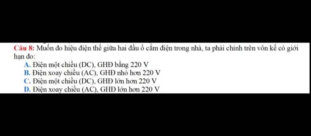 `+)` Hiệu điện thế `~~220V` nên phải chọn vôn kế có giới hạn đo `>220V` để tránh hỏng dụng cụ.
