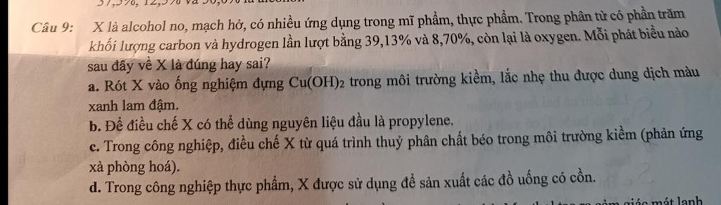 X là alcohol no, mạch hở, có nhiều ứng dụng trong mĩ phẩm, thực phẩm. Trong phân tử có phần trăm