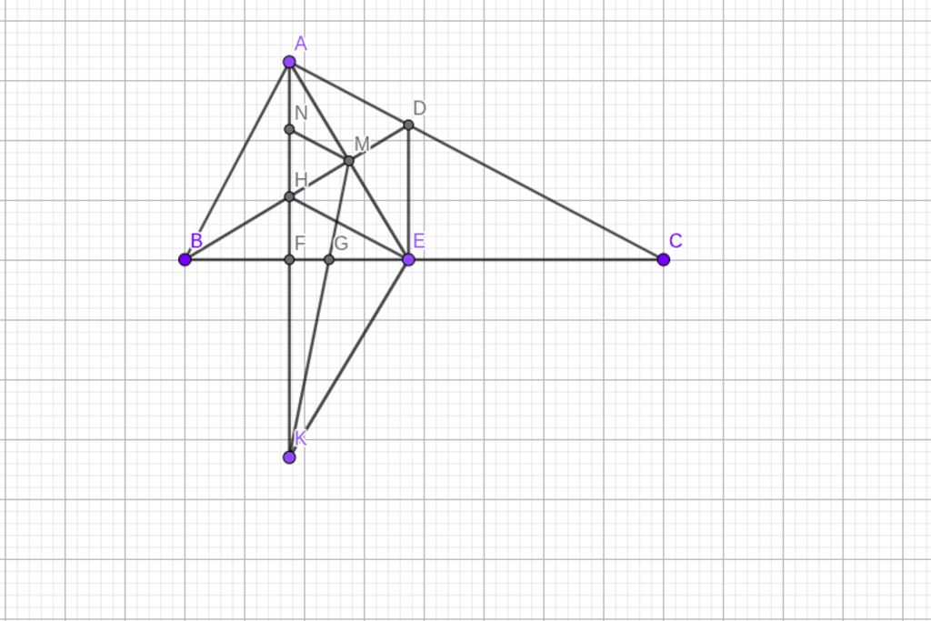 c) Kẻ 𝐴𝐹 ⊥ 𝐵𝐶(𝐹 ∈ 𝐵𝐶). Trên tia đối của tia 𝐹𝐴, lấy điểm 𝐾 sao cho 𝐹𝐾 = 𝐹𝐴. Gọi 𝐺 là giao điểm của 𝐾𝑀 và 𝐵𝐶. Chứng minh rằng: 𝐺 là trọng tâm của △𝐴𝐾𝐸.