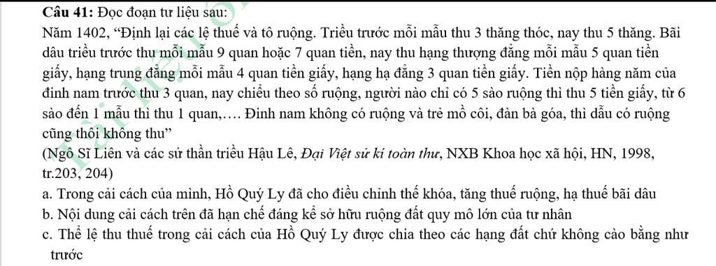 `=>` Đoạn tư liệu chỉ nói về điều chỉnh thuế, không nói đến việc hạn chế sở hữu ruộng đất lớn của tư nhân.