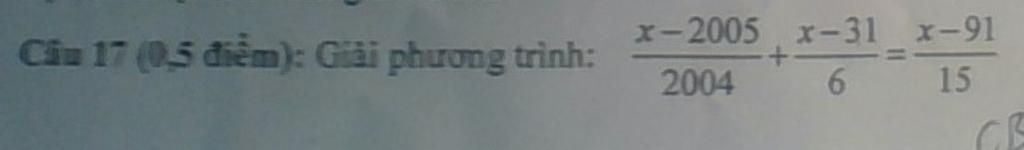 $\Leftrightarrow \dfrac{x}{2004} - \dfrac{2005}{2004} + \dfrac{x}{6} - \dfrac{31}{6} = \dfrac{x}{15} - \dfrac{91}{15}$
