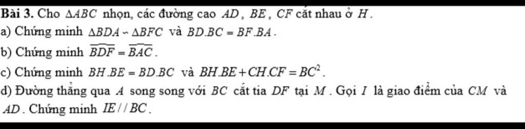 $\text{Từ câu a, } \Delta BDA \sim \Delta BFC \Rightarrow \dfrac{BD}{BF} = \dfrac{AD}{CF}$