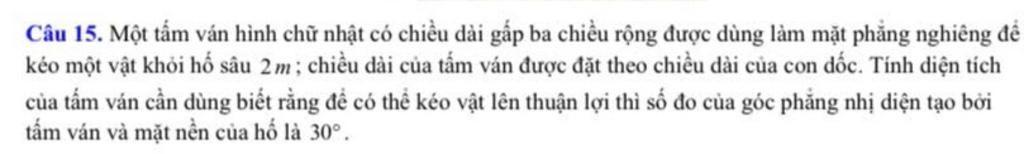 & \text{Gọi } \alpha \text{ là góc tạo bởi tấm ván và mặt nền của hố} \\