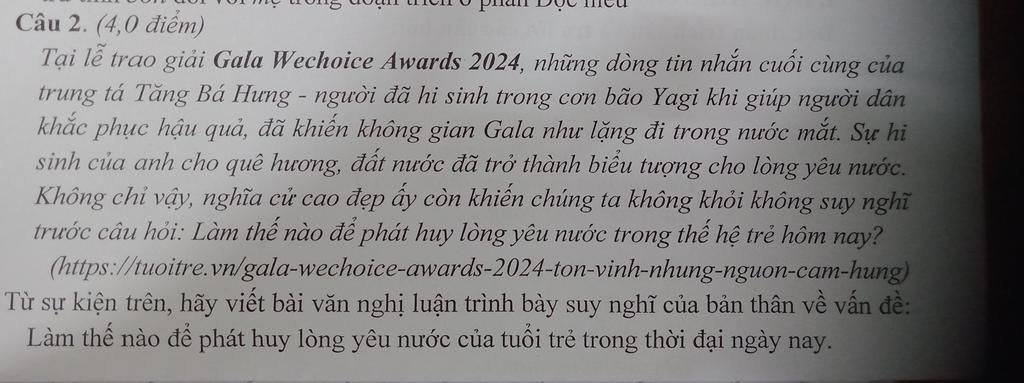 trả lời: Lòng yêu nước của thế hệ trẻ ngày nay cần được phát huy bằng những hành động thiết thực trong cuộc sống. Trước hết, mỗi người trẻ cần hiểu biết về lịch sử dân tộc, từ đó nuôi dưỡng niềm tự hào và ý thức trách nhiệm. Bên cạnh đó, cần chăm chỉ học tập, rèn luyện để trở thành công dân có ích cho xã hội. Ngoài ra, việc tham gia các hoạt động cộng đồng, giữ gìn bản sắc văn hóa và sống có trách nhiệm cũng là những biểu hiện cụ thể của lòng yêu nước. Trong thời đại công nghệ, người trẻ cần sử dụng mạng xã hội một cách văn minh, góp phần lan tỏa những giá trị tích cực. Như vậy, lòng yêu nước không chỉ là cảm xúc mà còn phải được thể hiện bằng hành động cụ thể mỗi ngày.