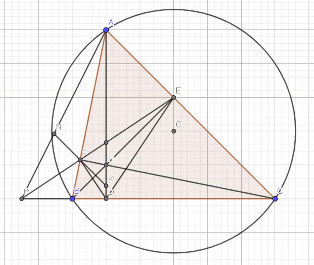 Cho ∆ABC nhọn nội tiếp đường tròn (O; R), biết AB<AC. Các đường cao AD, BE, CF của ∆ABC cắt nhau tại H. Gọi P là giao điểm của EF và CB. Qua F kẻ đường thẳng song song với AC cắt AP tại N, cắt AD tại K. I là giao điểm của AD và EF. Chứng minh: