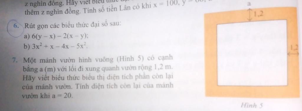 Bài 7: Tính diện tích mảnh vườn (Hình 5)Dựa vào hình vẽ, mảnh vườn ban đầu là hình vuông cạnh (m). Lối đi xung quanh rộng m nằm bên trong mảnh vườn.1. Viết biểu thức biểu thị diện tích phần còn lại: