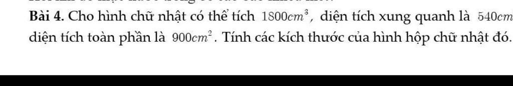 Gọi chiều dài, chiều rộng, chiều cao của hình hộp chữ nhật lần lượt là `a,b,h (cm)(a,b,h > 0)`