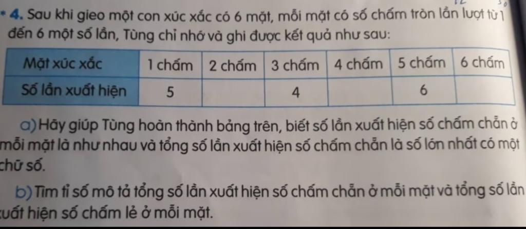 b) Tỉ số mô tả tổng số lần xuất hiện số chấm chẵn ở mỗi mặt và tổng số lần xuất hiện số chấm lẻ ở mỗi mặt là :