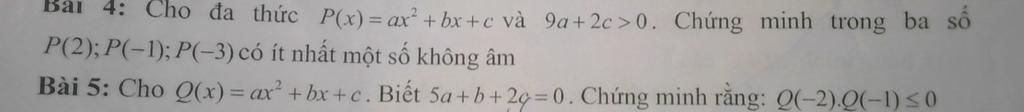 Bài 5: Cho Q(x)= ax +bx+c. Biết 5a+b+2c=0 . Chứng minh rằng: Q(-2).Q(−1)<0