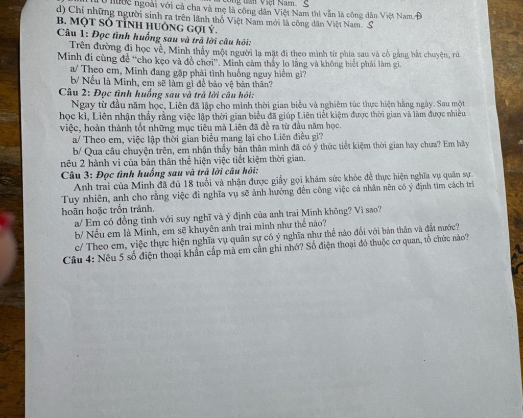a)Minh trong trường hợp trên đang gặp tình huống bị rủ rê đi làm những việc xấu , ko đúng với chuần mực đạo đức .Hoặc cũng có thể đang bị lừa đảo để bắt cóc