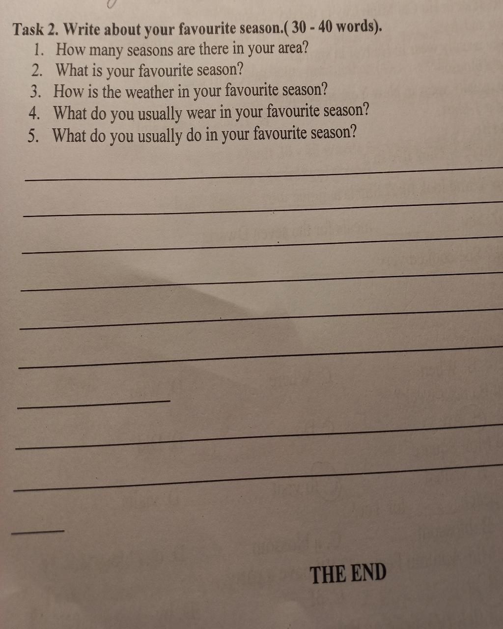 `->` There are four seasons in my area. My favourite season is summer. The weather is usually hot and sunny. I often wear a T-shirt and shorts. I like going swimming and eating ice cream with my friends