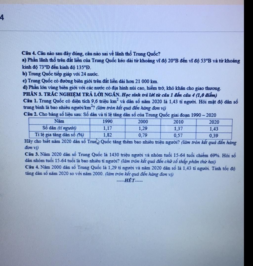 Câu 4:$\\$ $a \Bigg) \color{green}{\text{Đúng}}$$\\$ Giải thích: Đây là tọa độ địa lý chuẩn của phần lãnh thổ trên đất liền của Trung Quốc theo sách giáo khoa Địa lý.$\\$ $b \Bigg) \color{red}{\text{Sai}}$$\\$ Giải thích: Trung Quốc chỉ tiếp giáp với 14 quốc gia trên đất liền (như Việt Nam, Lào, Myanmar, Ấn Độ, Nga, Mông Cổ,...).$\\$ $c \Bigg) \color{green}{\text{Đúng}}$$\\$ Giải thích: Đường biên giới trên đất liền của Trung Quốc rất dài, thực tế khoảng hơn 22.000 km.$\\$ $d \Bigg) \color{green}{\text{Đúng}}$$\\$ Giải thích: Các khu vực biên giới phía Tây, Tây Nam và phía Bắc của Trung Quốc chủ yếu là núi cao, cao nguyên và hoang mạc, gây khó khăn cho việc xây dựng đường bộ để giao thương.$\\$ `\bbtext{Phần 3:}`$\\$ Câu `bb1:`$\\$ Mật độ dân số trung bình năm 2020 là:$\\$ $\dfrac{1,43 \times 10^3}{9,6} \approx 149 \rm{ (người/km^2)}$ $\\$ Câu `bb2:`$\\$ Số dân Trung Quốc tăng thêm trong năm $2020$ là:$\\$ $(1,43 \times 10^3)\times 0,39\%\approx 6$ (triệu người)$\\$ Câu `bb3:`$\\$ Số dân nhóm tuổi $15-64$ tuổi năm $2020$ là:$\\$ $(1\,430\times10^{-3}) \times 69\% = 0,99$ (tỉ người)$\\$ Câu `bb4:`$\\$ Tốc độ tăng dân số năm $2020$ so với năm $2000$ là:$\\$ $$\dfrac{1,43}{1,29} \times 100 \approx 111\%$$