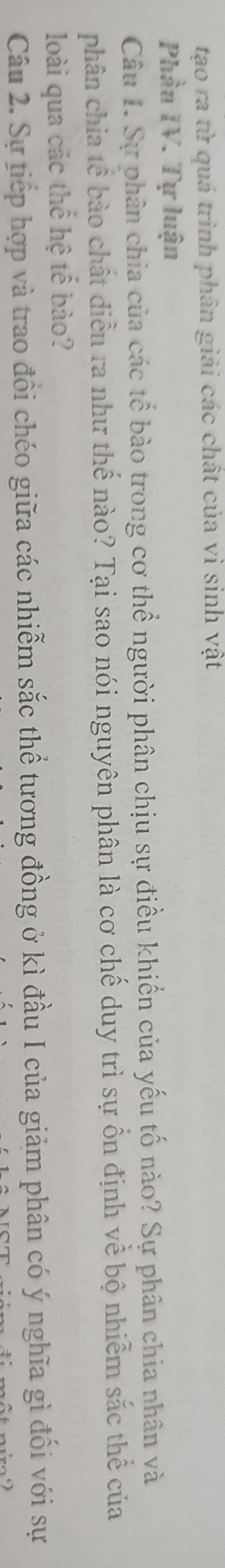 Đáp án: Sự phân chia tế bào trong cơ thể người được điều khiển bởi một hệ thống phức tạp bao gồm các tín hiệu bên trong (gen, protein) và yếu tố bên ngoài (hormone, yếu tố tăng trưởng) thông qua chu kỳ tế bào.
