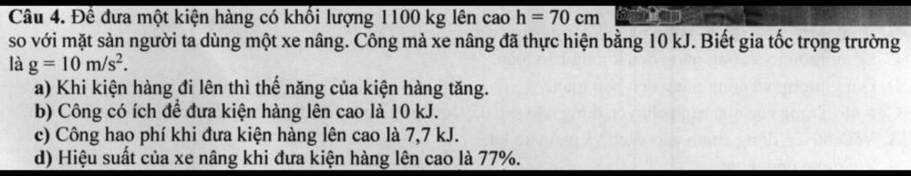 c Công hao phí khi đưa kiện hàng lên cao là 7,7kJ