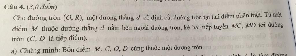 Từ (1) và (2) `=>4` điểm `M,C,O,D` thuộc đường tròn đường kính `OM`