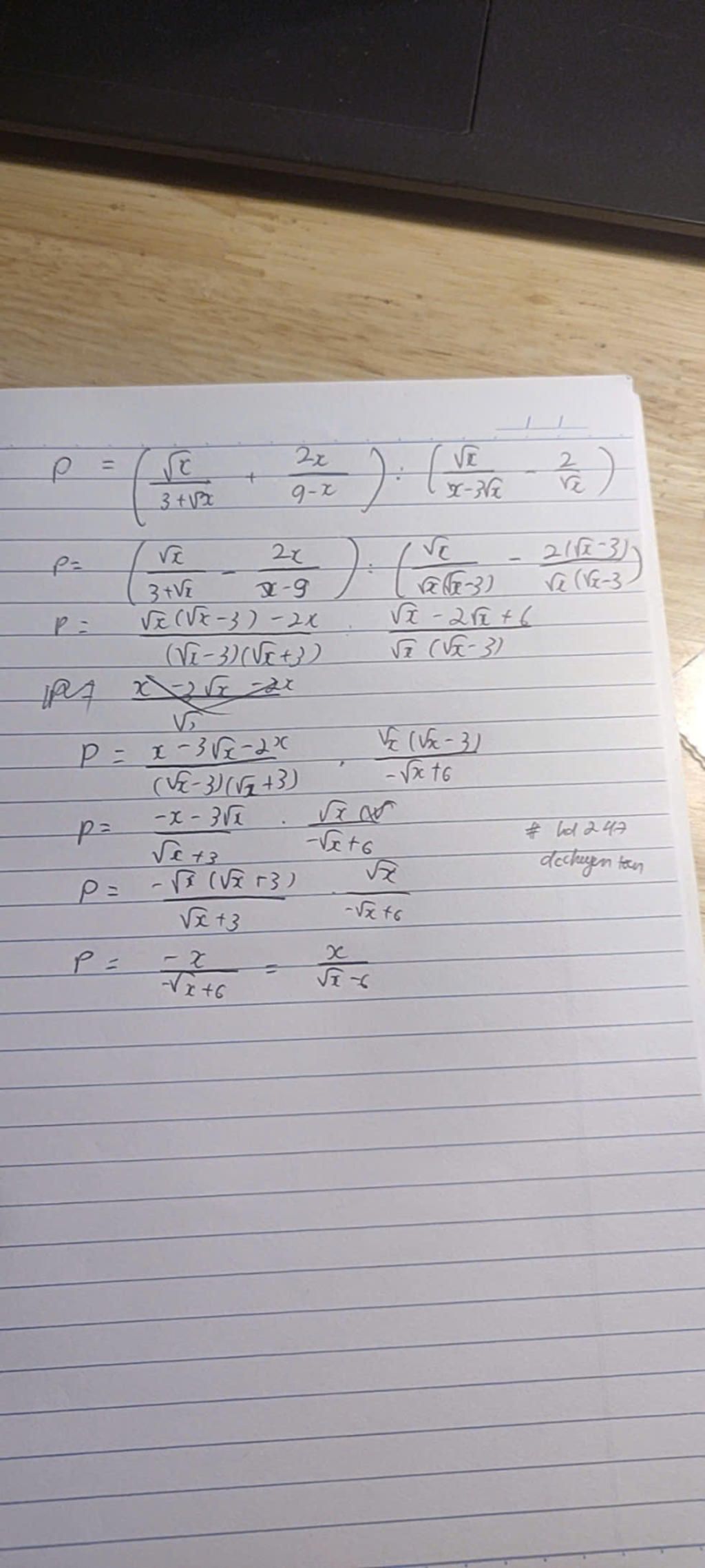 `P=(-sqrtx(sqrtx+3))/((sqrtx-3)(sqrtx+3)). (sqrtx(sqrtx-3))/(-sqrtx+6)`