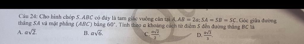 $⇒$ Khoảng cách $d(S, BC) = SH = a\sqrt{6}$.