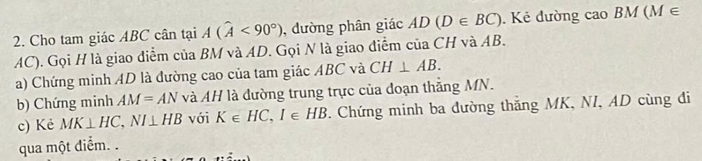 Suy ra `AH` là phân giác cũng là đường trung trực của `ΔAMN`