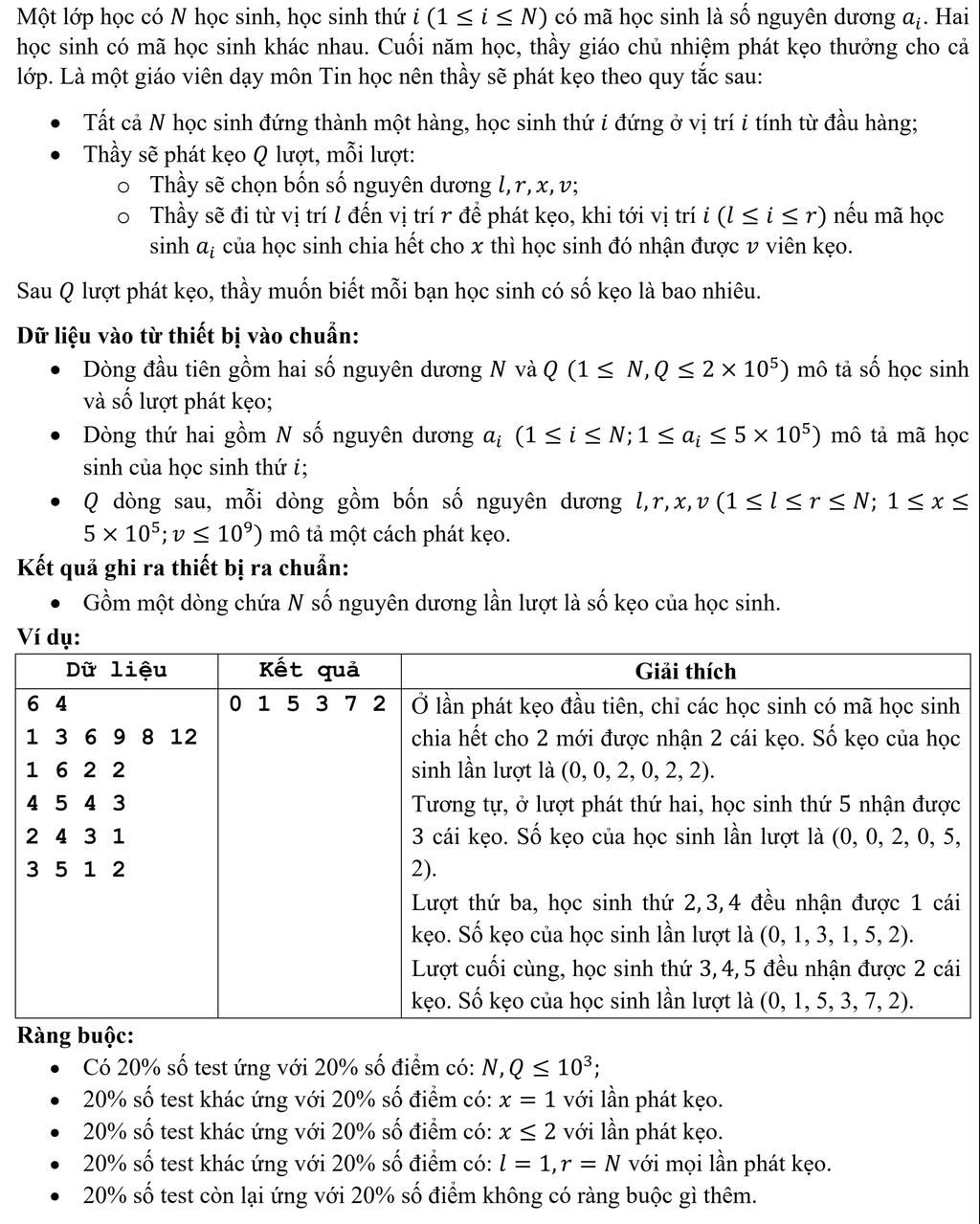 Ac ơi, giúp em giải bài này vs ạ. C++ hoặc Python, 5* + CTLHN nếu đúng. E dùng diff array r vẫn tle