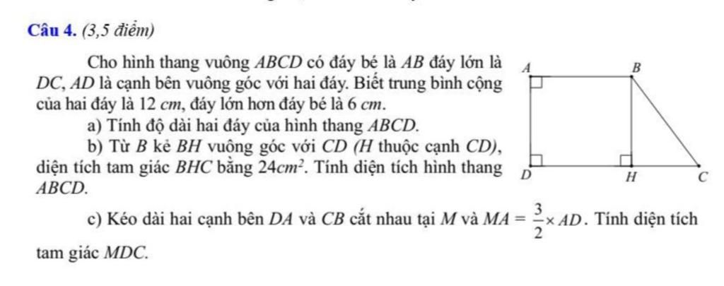 Chiều cao $MA$:$$8 \times 3 : 2 = 12 \text{ cm}$$Tổng chiều cao $MD$:$$12 + 8 = 20 \text{ cm}$$Diện tích tam giác $MDC$:$$20 \times 15 : 2 = 150 \text{ cm}^2$$Đáp số: a) $9 \text{ cm}$ và $15 \text{ cm}$b) $96 \text{ cm}^2$c) $150 \text{ cm}^2$