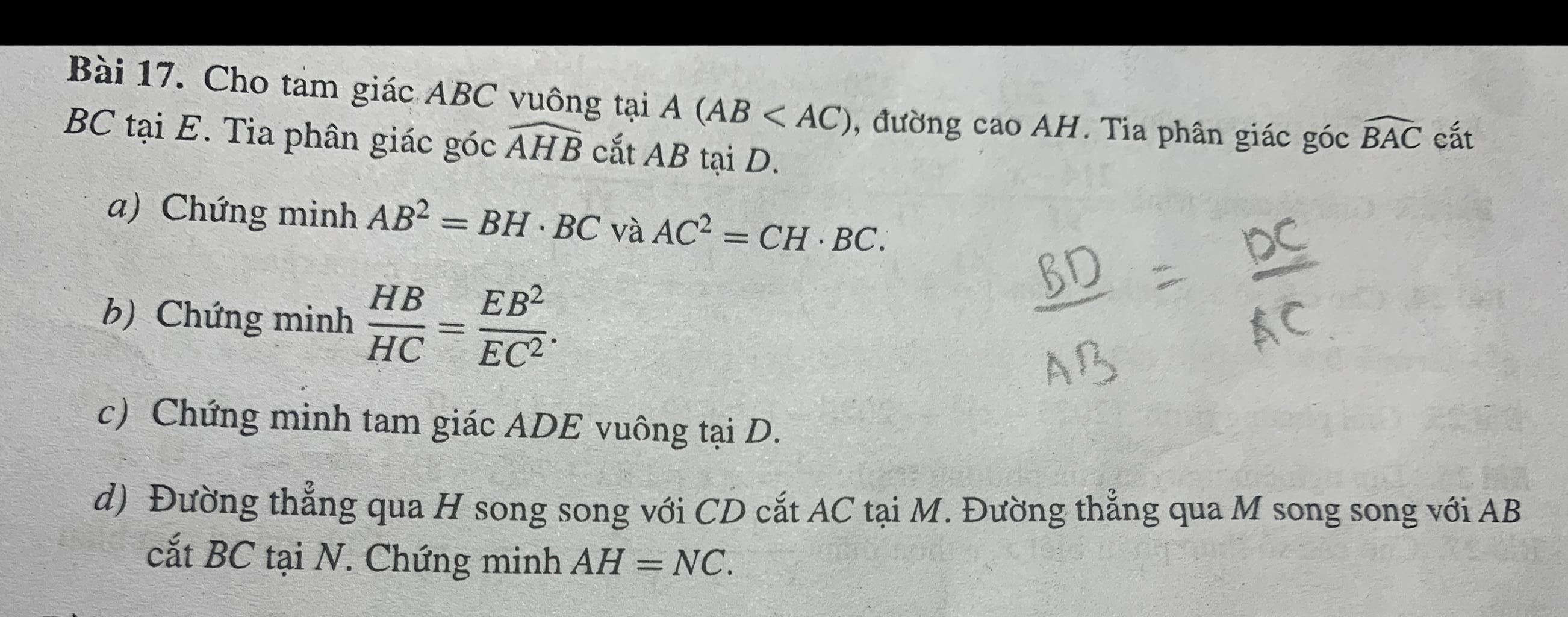 Bài 17. Cho tam giác ABC vuông tại A (AB < AC), đường cao AH. Tia phân giác góc BAC cắt
