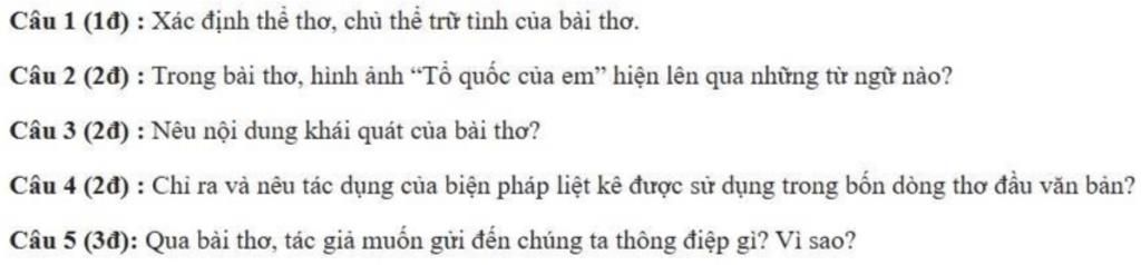 Câu 2: Hình ảnh "Tổ quốc của em" hiện lên qua: