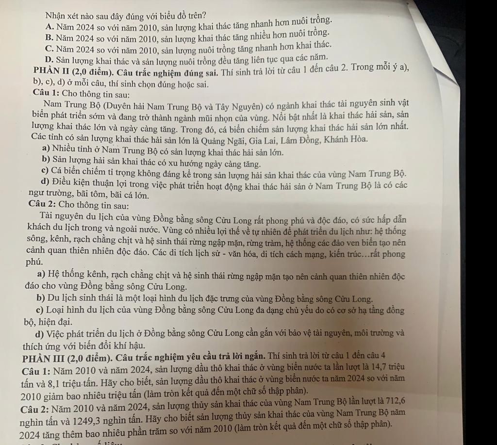 A. Năm 2024 so với năm 2010, sản lượng khai thác tăng nhanh hơn nuôi trồng.