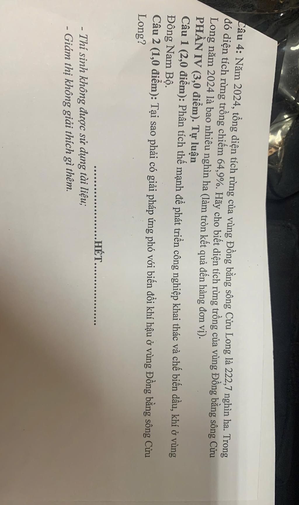 Câu 4: Năm 2024, tổng diện tích rừng của vùng Đồng bằng sông Cửu Long là 222,7 nghìn ha. Trong