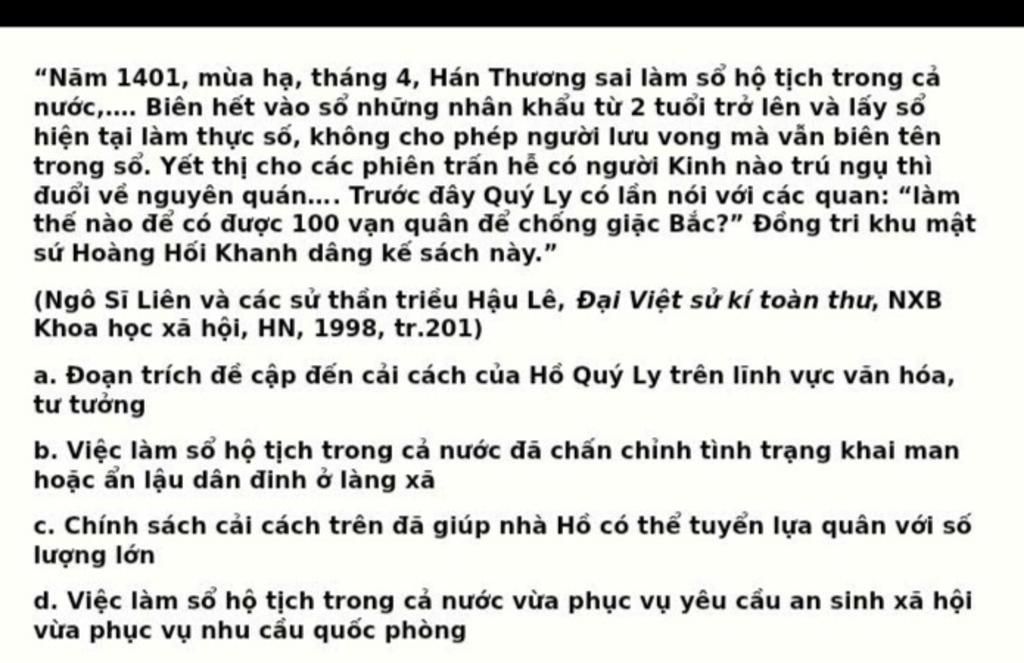 c. Đoạn trích nêu rõ mục tiêu `“`có được `10` vạn quân để chống giặc Bắc`”`, nên việc lập sổ hộ tịch phục vụ trực tiếp cho việc tuyển quân số lượng lớn.
