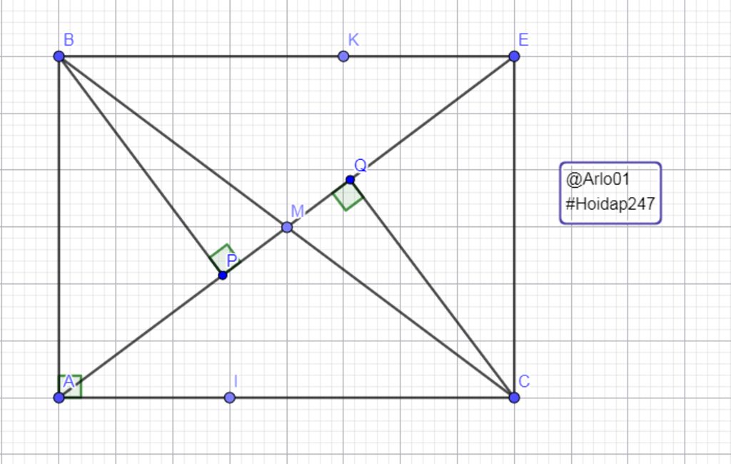 + Cho tam giác ABC vuông tại A (AB < AC). Gọi M là trung điểm của BC. Trên tia đối của tia MA lấy điểm E sao cho ME = MA. Gọi I là một điểm trên đoạn thẳng AC (I khác A và C); K là một điểm trên đoạn thẳng EB (K khác E và B) sao cho AI = EK. Từ điểm B và điểm C kẻ các đường thẳng BP và CQ lần lượt vuông góc với đường thẳng AE (P, Q thuộc AE). Chứng minh AP + AQ = BC.