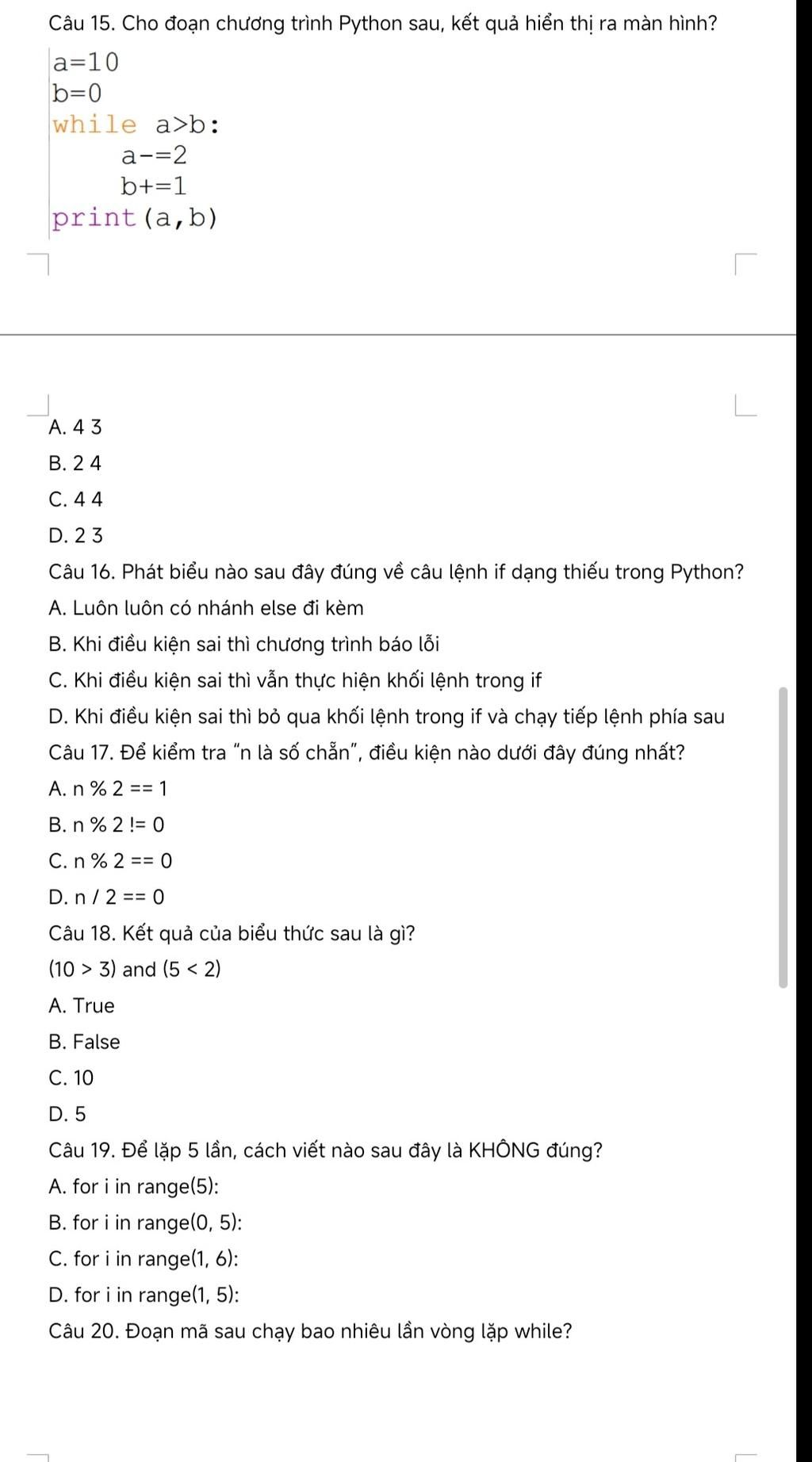 Câu 15. Cho đoạn chương trình Python sau, kết quả hiển thị ra màn hình?