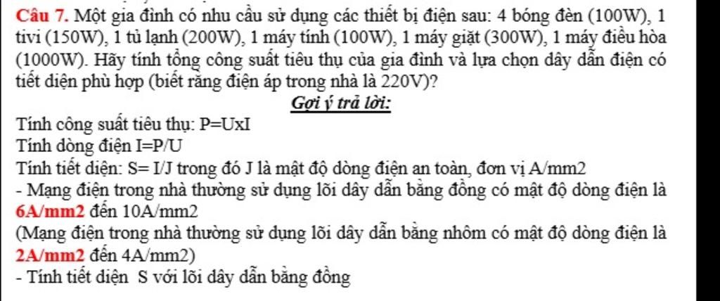 (1000W). Hãy tính tổng công suất tiêu thụ của gia đình và lựa chọn dây dẫn điện có