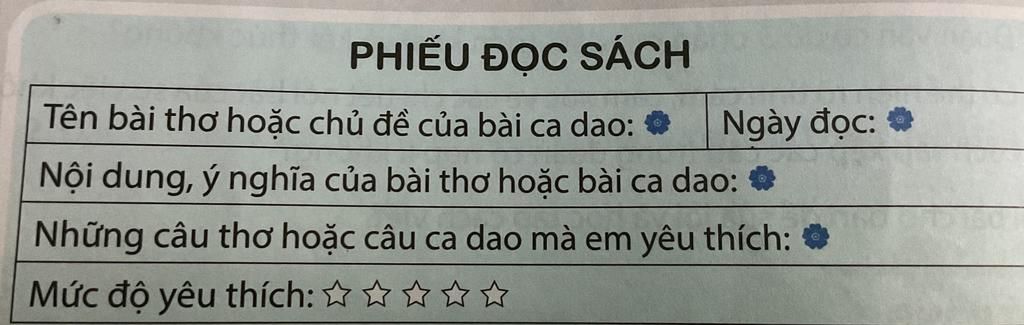 MụcNội dung chi tiếtTên bài thơ hoặc chủ đề:Bài ca dao về Thăng Long - Hà NộiNgày đọc:23/04/2026Nội dung, ý nghĩa:Bài ca dao ca ngợi vẻ đẹp nghìn năm văn hiến và sự sầm uất của kinh thành Thăng Long xưa, giúp người đọc thêm tự hào về lịch sử dân tộc.Câu ca dao em yêu thích:"Gió đưa cành trúc la đà / Tiếng chuông Trấn Vũ, canh gà Thọ Xương."Mức độ yêu thích:⭐⭐⭐⭐⭐ (5 sao)