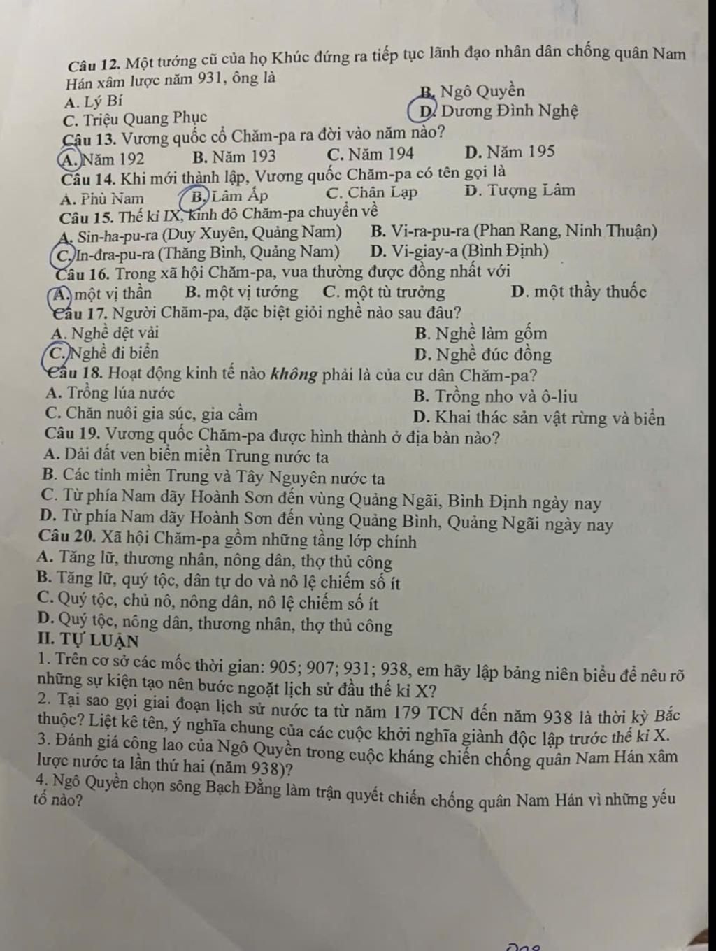 `o.` Vương quốc Chăm - pa được hình thành vào cuối thế kỷ `II` năm `192` sau cuộc khởi nghĩa của Khu Liên chống lại nhà Hán.