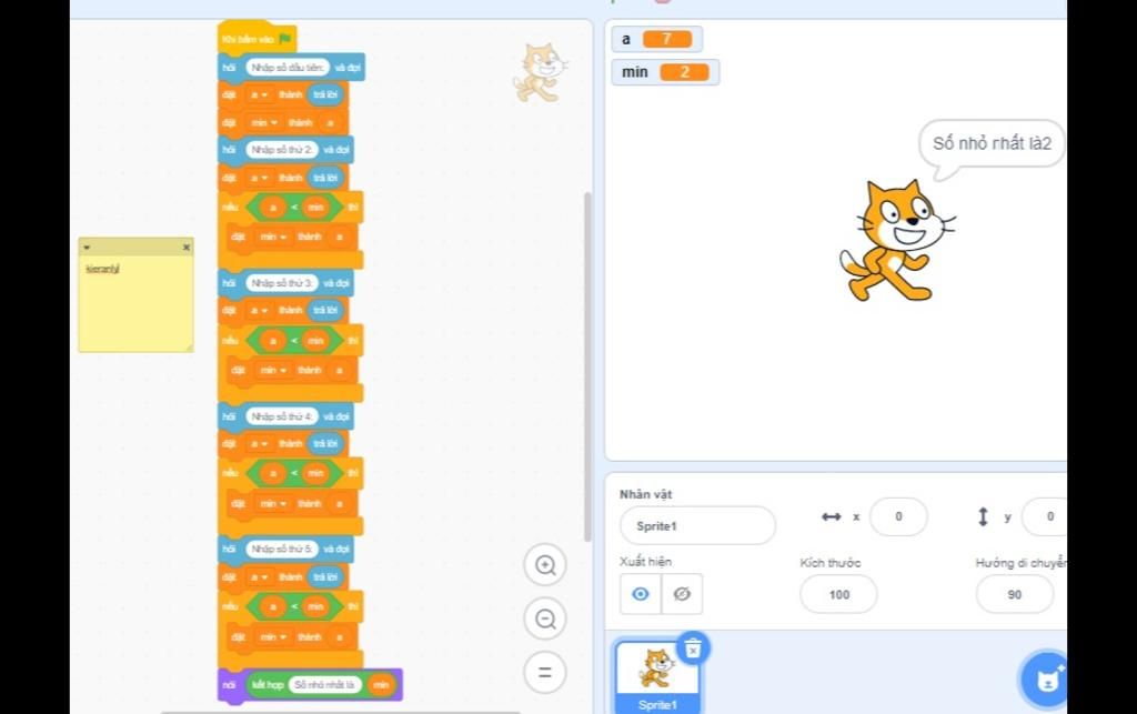 Tạo chương trình Scratch nhập vào 5 số từ bàn phím. Tìm và hiển thị số có giá trị nhỏ nhất trong 5 số đó.