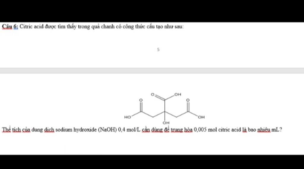 Citric acid có `3` nhóm `–COOH ⇒ 1` mol acid phản ứng với `3` mol `NaOH`