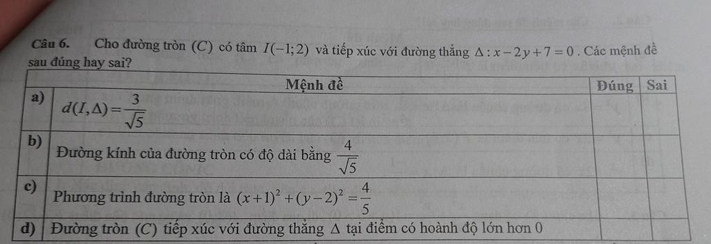 Đường kính của đường tròn là: `2d(I;Delta)=2 . (2\sqrt{5})/5=(4\sqrt{5})/5`