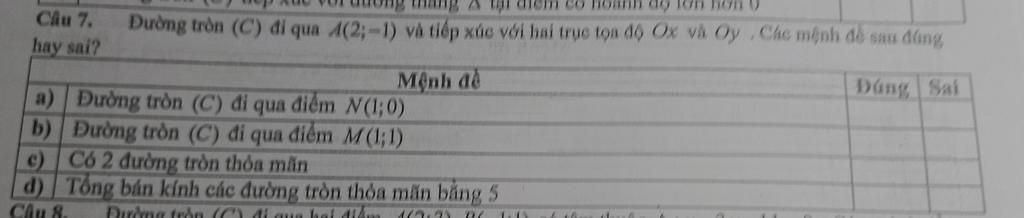 b) Sai: Thay tọa độ M(1; 1) vào cả hai pt đường tròn đều không cho kết quả đúng (với R=1 ta được 0 + 4 khác 1; với R=5 ta được 16 + 36 khác 25).